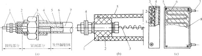 图3-1-15食品烤炉常用辐射元件结构 (a)金属氧化镁远红外辐射管结构 1-接线装置 2-导电杆 3-紧固装置 4-金属管 5-电热丝 6-氧化镁粉 7-辐射管表面涂层 (b)碳化硅管远红外辐射元件结构 1-普通陶瓷管 2-碳化硅管 3-电阻丝 4-接线装置 5-辐射涂层 (c)碳化硅板式辐射元件 1-远红外辐射层 2-碳化硅板 3-电阻丝压板 4-保温材料 5-安装螺栓 6-电阻丝 7-接线装置 8-外壳 表3-1-4 几种辐射元件对食品烘焙对比表