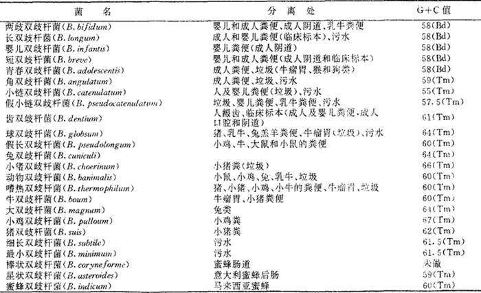 | 释义 | 概述 蒂斯(Tissier)首先从母乳喂养儿的粪便中分离到一革兰氏阳性无芽孢杆菌(1899年),菌细胞的弯曲末端见有分叉,命名为普通双歧杆菌(Bacillus bifidus communis)。次年(1900年)发现此菌不仅数量多(占细菌总数98%以上),而且与婴儿健康密切相关。 双歧杆菌分类史上曾归于奴卡氏菌属、棒杆菌属、乳杆菌属和放线菌属,直到60年代才作为独立的菌属——双歧杆菌属(Bifido bacterium)。双歧杆菌属主要寄生在人和动物(如马、羊、牛、鸡、狗、猪、蜜蜂、兔、大鼠等)肠道内,是人和动物重要的生理性细菌。该属包括24个种(表5-1)。本章主要介绍与人类密切相关的10个菌种。 表5-1 双歧杆菌菌种、分离处和G+C值
