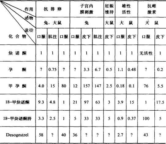 注:FHI:国际家庭卫生 WHO:世界卫生组织 P.C:美国人口理事会 NIH:美国国立卫生研究所 四、生物活性 根据内分泌生物测定的动物试验各种激素的相对活性强度见下列表格(引自Contraception1987,36:181Phillips et al.) 表3-1-2 各种合成孕激素的生物话性