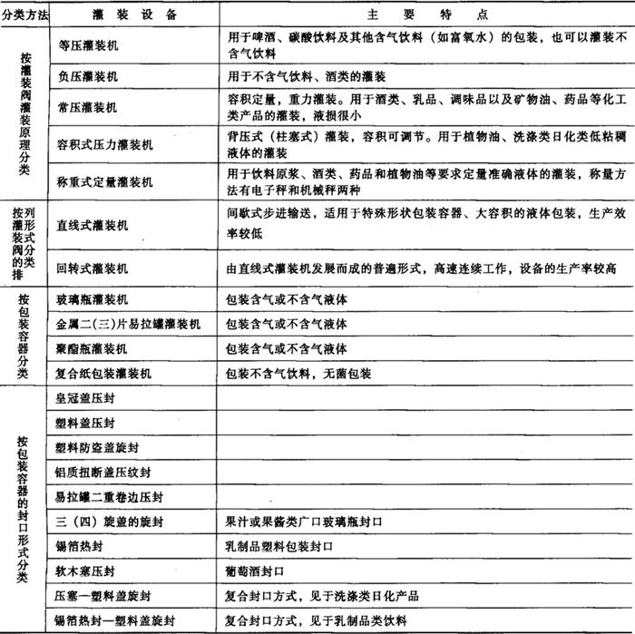 | 释义 | 概述 液体包装是包装行业的重要组成部分,主要包括对食品领域中饮料、啤酒、乳品、白酒、葡萄酒、植物油、调味品的包装,还涉及医药、洗涤类日化、矿物油、农药等化工类液体产品的包装。目前,国内液体灌装设备大部分用于食品行业。 1 国内外饮料灌装设备的发展历程 饮料灌装机械是伴随饮料工业的产生而产生,并伴随饮料工业的发展而发展的。1890年美国制造出玻璃瓶灌装机,1902年灌装番茄酱的压力灌装机开始使用。1912年发明了皇冠盖封口机,后来集灌装和压盖于一体的灌装压盖机组问世。在本世纪初,啤酒酿造业发达的德国制造出手动啤酒灌装和压盖机。 含气饮料的灌装工艺难度大,其灌装设备的发展大体经历了三个阶段。第一阶段是1952~1957年,在这一阶段完成了含气饮料灌装机由差压灌装向等压灌装的过渡,采用的是机械阀。第二阶段是1957~1979年,这期间德国首先发明了等压弹簧阀,之后法国与前苏联也研制出弹簧阀,为灌装机的高速化创造了条件。第三阶段是以1980年德国发明了电动阀为标志,电动阀的出现使灌装机的水平又提高到一个新的阶段。 我国饮料灌装机械制造业起步晚,60年代前基本上是空白,当时国内啤酒厂和汽水厂都是使用美国和日本30~40年代的设备。60年代我国才开始研究和生产灌装设备。进入70年代后,我国先后引进了一些国外灌装生产线,促进了我国包装机械行业进入一个新的发展时期。机械、轻工和军工等部门的企业开始在消化吸收国外技术的基础上,研制出各种中、小型饮料灌装机械。我国包装机械的发展,装备了国内一大批饮料厂,促进了我国饮料业的发展。进入80年代,我国采用技贸结合的方式,引进20000瓶/h的啤酒灌装线和18000瓶/h的含气饮料灌装线的制造技术,到90年代又引进了36000瓶/h的啤酒灌装线及生产技术。这样我国不仅能够生产中、小型的灌装设备,而且开始生产大型灌装线,技术水平上了一个档次,将我国液体灌装设备制造业的整体水平提高到了一个新的阶段。 2 液体灌装设备的分类 现就在食品行业(部分包括化工行业)常见的,灌装容量在150~2000mL的设备进行简单分类,如表2-2-1所示。 表2-2-1 液体灌装设备的分类
