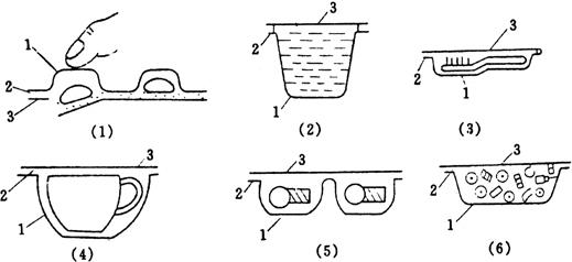 | 释义 | 概述 热成型-充填-封口机械是在加热条件下使热塑性片材制成包装容器,然后进行充填、封口的机器。 热成型-充填-封口机包装物品的形态如图2-8-1所示。其包装材料分为上下两层,通常下层(亦可为上层)采用热塑性片膜在加热状态成型为所需形状的容器,一般推荐使用厚度为0.15~0.3mm;上层(亦可为下层)采用铝箔、玻璃纸、复合薄膜等较薄的材料作为覆盖膜与容器热合,推荐厚度为0.02mm左右。