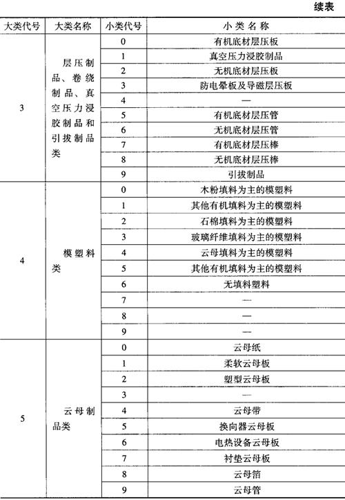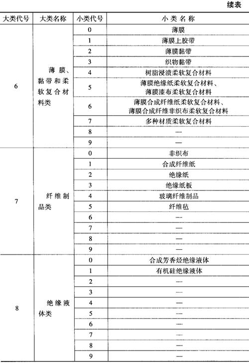 | 释义 | 概述 在电工技术中,电阻系数大于109Ω·cm的材料叫做绝缘材料,它可以把电气设备中电位不同的带电部分隔离开来。所以,它具有较高的绝缘电阻率,并能避免漏电、击穿等事故。 1.电气绝缘材料的分类 电气绝缘材料产品按大类、小类、温度指数及品种的差异进行分类。 (1)大类:电气绝缘材料产品按形态结构、组成或生产工艺特征划分为八大类,并用数字1~8来分别表示,见表13-1。如云母制品类用5表示。 表13-1 电气绝缘材料产品的大类代号与小类代号