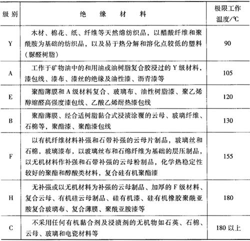 (4)品种:电气绝缘材料的基本分类单元为品种,同一品种产品的组成基本相同。品种代号用一位阿拉伯数字表示。 绝缘材料的产品型号由四位阿拉伯数字组成,对允许不按温度指数分类的电气绝缘材料,用三位数字表示。对有些产品,有必要时可增加附加代号(英文字母或连字符后接阿拉伯数字)来表示不同的品种,其含义应在产品标准中规定。对于云母制品,其型号连字符后接的阿拉伯数字的含义为:“1”表示粉云母制品;“2”表示金云母制品;“3”表示金粉云母制品。 示例1:1032三聚氰胺醇酸浸渍漆,其中:第一位数字“1”表示该产品归属第1大类;第二位数字“0”表示该产品归属第1大类中的第0小类;第三位数字“3”表示该产品的温度指数不低于130;第四位数字“2”为该类产品的品种代号。 示例2:501云母纸,其中:第一位数字“5”表示该产品归属第5大类;第二位数字“0”表示该产品归属第5大类中的第0小类;第三位数字“1”表示该产品的品种代号。 绝缘材料的主要性能指标有绝缘耐压强度、抗张强度、耐热等级、相对密度(比重)、膨胀系数等。电工绝缘材料按其正常运行条件下允许的最高工作温度分级叫做耐热等级,见表13-3。 表13-3 电气绝缘材料的耐热等级