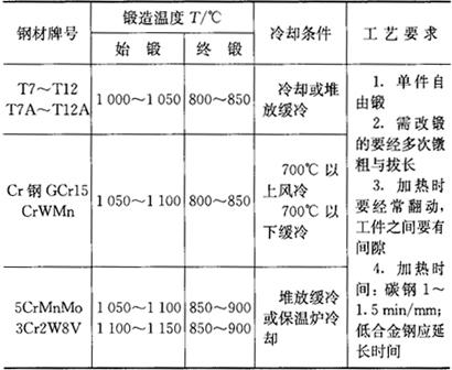 注:1.表列余量均不包括锻件之凸面及圆弧。 2.表列长度方向之余量及公差,不适于锻后再切断的坯料。 ③对于模具主要零件,其坯料应采用改锻工艺,即坯料在锻造时经多次镦粗和拔长,以改进锻件致密度,使内部组织均匀,改进其使用性能和力学性能。 ④锻件表面不应有裂纹、氧化、脱碳层和锻造不平现象。其尺寸应符合图纸要求,内部不应有夹层现象。 3.锻造工艺要求 ①碳素工具钢和低合金工具钢等的锻造工艺要求见表7.1-6。 表7.1-6 碳素工具钢和低合金工具钢等锻造工艺要求
