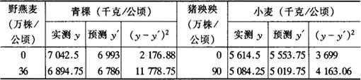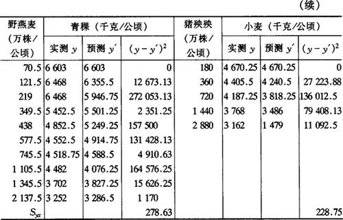 式(2)中,y为存在杂草竞争时的作物产量;y0为无杂草竞争时的作物产量,其他参数与式(1)相同。 可见,用式(2)不仅可以求得杂草竞争情况下的作物产量,还能算出无杂草竞争时的作物产量。式(2)对野燕麦和猪殃殃分别危害青稞和小麦的预测结果表明,在已实测得某一杂草密度下的作物产量时,式(2)的确能较准确地预测不同杂草密度情况下的作物产量,其预测误差分别仅为279千克/公顷和229千克/公顷(表3-10)。 表3-10 式(2)预测野燕麦和猪殃殃竞争分别对青稞和小麦产量的影响