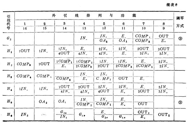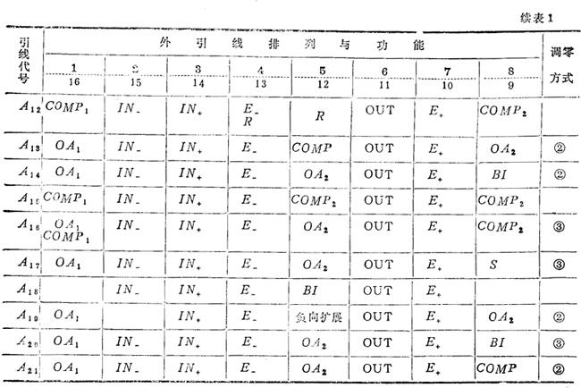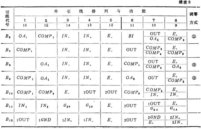 由表15-28还可知,集成运放的调零方式和补偿方法。凡外引线功能表中同一行中有OA1、OA2和OA3者,表示外接调零电位器的动端接OA2,电位器的其他两个端头分别接OA1和OA3,并在调零方式栏中注以①。注②表示OA1和OA2接调电位器的两固定端,动端接E+。注③表示OA1和OA2接电位器的固定端,而动端接E-。 补偿方式有四种。在外引线功能表15-28中的某一行里有一个补偿端COMP者,即应将补偿元件(一般为一个电容器)接向输出OUT端;有两个补偿端COMP1和COMP2者,应将补偿元件接在这两个端头之间;有三个补偿端COMP1,COMP2和COMP3者,应将第一个补偿元件接在COMP1和COMp2之间,第二个补偿元件接在COMP3和OUT之间;有四个补偿端时,应分别将补偿元件接在COMP1和COMP2之间以及COMP3和COMP4之间。 表15-28中的BI为偏流输入端,如偏置电阻较大,占用芯片面积大,则使用外接偏置电阻。一般BI端通过一个1MΩ左右的电阻接向E+,个别的接向E-。在表中注明两个R的,表示电阻R接在此两引线端之间。 表15-28中的S表示选通端,G表示增益调节端。 集成运放的国家标准前面冠以CF,后面是数字序号,该数字序号与国际流行的相应运放型号的数字序号相同。例如CF741与μA741完全相同,序号也一致。F打头的是部标型号,不是以CF、F打头的是厂标型号。 在表15-21至15-27性能参数表中各符号含义如下: Ui。——输入失调电压; αUi。——输入失调电压的温度系数; I1B——输入偏置电流; AUD——开环差模直流电压增益; KCMR——共模抑制比; UOPP——输出峰峰值电压; UiCM——最大共模输入电压范围; BW——开环带宽; UiCM——最大共模输入电压范围; UiDM——最大差模输入电压范围; PC——静态功耗; Ri——输入阻抗; EM——输出电压。 (四)集成稳压器功能参数表 表15-29W7800、W7900系列三端集成稳压电路参数