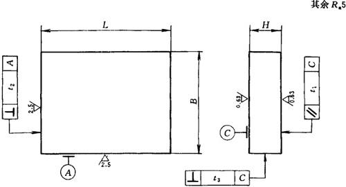 技术条件:①图中标注的形位公差值按GB1184—80的附录一,t1为5级,t2为6级,t3为8级。当用作定模固定板、动模固定板时,根据使用要求t2、t3的等级由承制单位自行决定;②以A为基准的直角相邻两面应作出明显标记。标记方法由承制单位自行决定;③其它按GB4170—84。