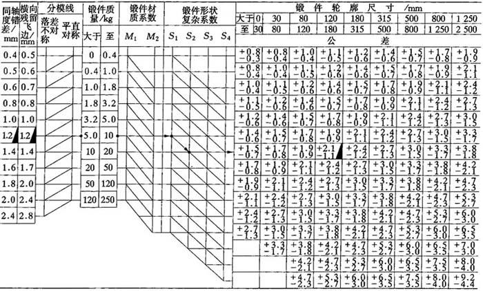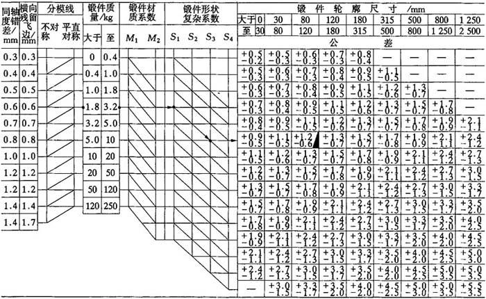 注:锻件高度台阶尺寸公差,按±1/2的比例分配.内表面尺寸公差,正负符号与表中相反. 例:当锻件质量为6kg、材质系数M1、锻件复杂系数S2、锻件尺寸160mm,平直分模线时各类公差查法. 表7-16 模锻件的长度、宽度、高度公差及错差、残留飞边量(精密级)(JB3834—85)