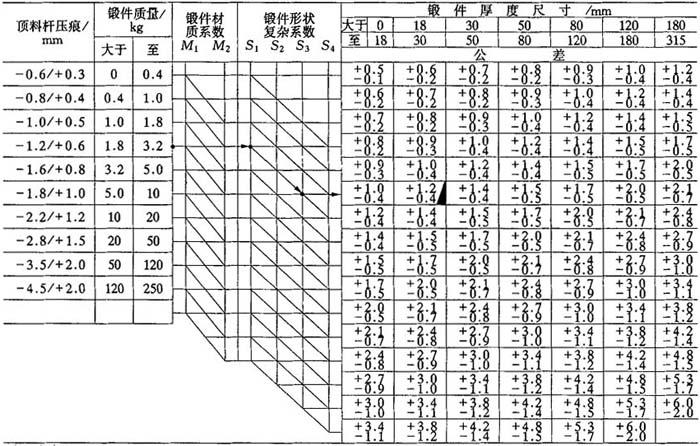 例:当锻件质量为3kg、材质系数为M1、锻件复杂系数为S3、锻件最大厚度尺寸为45mm、油炉加热时各类公差查法. 表7-18 模锻件的厚度公差及顶杆压痕公差(精密级)(JB3834—85)