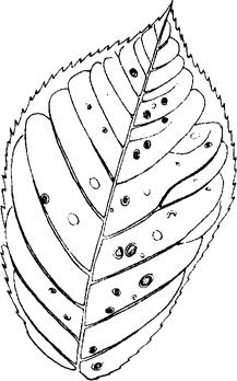 【症状】 病菌为害叶片、新梢和果实,但主要为害叶部。在叶上、叶片两面产生圆形或近圆形病斑,直径约1~4毫米,边缘清晰,并略带环纹,外围有时呈紫色或红褐色,中央灰白色或褐色,略带轮纹。后期偶尔在病斑两面产生灰褐色霉状物,此即分生孢子器。分生孢子器以叶背产生为多。病斑常干枯脱落,形成穿孔。病斑孔洞的边缘整齐。穿孔多的叶片常提早脱落。新梢上的病斑紫褐色,斑上亦产生灰褐色霉状物(图9-46)。