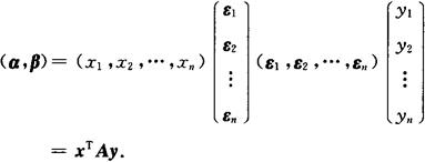 其中A=AT,(元素的乘法是内积)则称A是Vn在基ε1,ε2,…,εn下的度量矩阵.显然度量矩阵由Vn的一组基的内积所确定. 内积的坐标表达式 设ε1,ε2,…,εn是Vn的一组基,α=x1ε1+x2ε2+…+xnεn,β=y1ε1+y2ε2+…+ynεn,则
