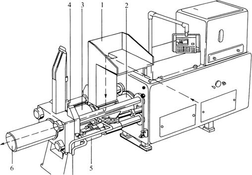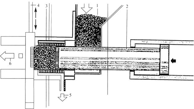 图3-3-27 肉骨分离机 1-骨肉进料口 2-冲压圆筒 3-冲压室 4-骨头出口 5-去骨肉出口 6-未分离的骨肉出口