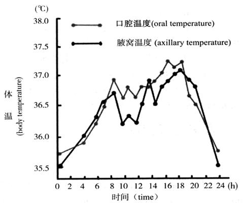 | 释义 | 正常体温及其生理变动 (一)正常体温由于血液温度不易测量,临床上测量腋窝、口腔或直肠的温度代表体温。直肠温度(rectal temperature)正常为36.9~37.9℃,比较接近机体深部的温度。口腔温度(oral temperature)比直肠温度低,正常值为36.7~37.7℃。腋窝温度(axillary temperature)比口腔温度低,正常值为36.0~37.4℃。需要注意的是,测定直肠温度时应将体温计插入直肠6cm以上,才能测得机体深部温度;测定口腔温度时应将温度计置于舌下,将口闭紧,以免受吸入空气的影响;测定腋窝温度时,要保持腋窝干燥,让被测者将上臂紧贴胸廓,测定时间至少需要10分钟,以使机体深部的热量逐渐传过来,避免测得的只是腋窝处的皮肤表层温度。测定腋窝温度不易发生交叉感染,是测量体温最常用的方法。体温虽然比较稳定,但也不是固定不变的。 (二)体温的生理变动 1.昼夜变动 生理情况下,体温具有昼夜周期性波动,每日清晨2~6时体温最低,午后1~6时最高,以后逐渐下降,午夜后又达最低水平,每天波动的幅度不超过1℃(图10-2)。体温的这种昼夜周期性波动称为昼夜节律(circadian rhythm),它产生的原因还不清楚。现在认为这种现象是由体内存在的生物钟(biological clock)控制的。高等动物的下丘脑可能具备生物钟的机能,下丘脑的视交叉上核(suprachiasmatic nucleus)很可能是生物节律的控制中心。