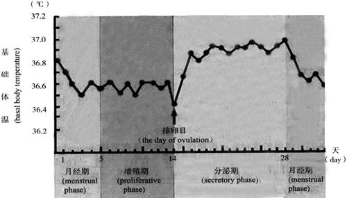 图10-2 人体温的昼夜变动 2.性别差异 同龄相比,女子的平均体温较男子高0.3℃,这可能与女性皮下脂肪较多,导热性较差,散热较少有关。此外,生育期女子的基础体温(basal body temperature)(清晨醒来,未起床测得)还随月经周期发生规律性变化(图10-3)。月经期和排卵前期体温较低,排卵日又降低0.2℃,为月经周期中体温最低的时间,此后体温升高,较排卵前期高0.2~0.5℃,排卵后期体温一直处于较高水平,至下次月经来潮体温又下降,恢复到月经期和排卵前期体温的水平。排卵后期体温增高与血中孕激素及其代谢产物增高一致。临床上可通过测定女子的基础体温,检测受试者的排卵日期。