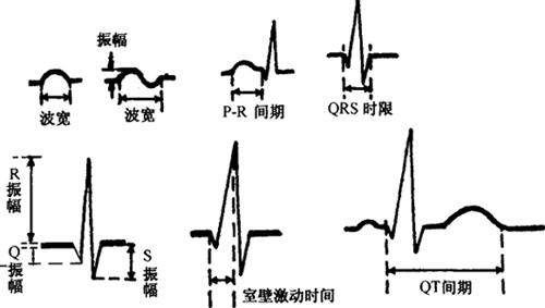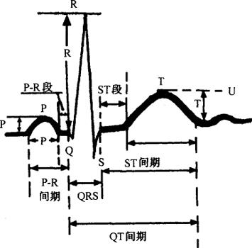 图7-1 典型心电图图解 ①P波:为心电图曲线上第一个波,称P波,是左、右心房除极波。 ②Ta波:为心房复极波,一般埋藏在QRS波群之内。 ③QRS波群:为心电图曲线上第二个波群,称为QRS波群,是心室除极波。QRS波群中第一个向下波称Q波,其后第一个向上波称R波,若有第二个向上波则称为R′波,R波之后第一个向下波称为S波,若有第二个向下波则称为S′波。若只有一个向下波称为QS波。QRS波群振幅≤4mm的用英文小写字母q、r或s表示,波幅≥5mm的则用英文大写字母Q、R、S表示。 ④T波:为心电图曲线上第三个波,代表心室复极波。 ⑤U波:有时在T波之后可出现一个波即为U波,一般认为是浦肯野纤维复极波。 (2)间期的命名和生理意义 ①P-R间期:从P波的起点到QRS波群开始之间距离的时间,代表激动从窦房结发出,经心房、房室交界区、希氏束到达心室的传导时间。 ②P-R段:从P波结束到QRS波群起始之间的距离,是心房除极结束到心室除极开始的时间(即为P-R间期时间减去P波时间)。 ③QRS波时间:从QRS波群开始至终点,为激动在心室的传导时间。 ④ST段:为QRS波群终点到T波开始的一段,代表心室除极完毕到复极早期的时间。 ⑤Q-T间期:从QRS波开始到T波终点的时间,代表心室除极和复极过程所需要的时间。 (3)心电图测量方法(图7-2)