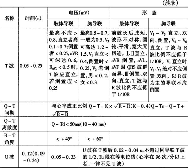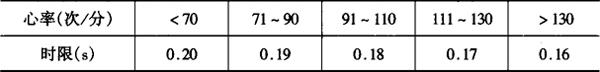 图7-2 心电图测量方法 ⑥心电图上时间与电压计算:一般心电图在描记时走纸速度为25mm/s,定标为10mm。心电图图纸上每一小方格的高、宽均为1mm,高度代表电压,1mm=0.1mV,宽度代表时间,1mm=0.04s。如果走纸速度和电压有调整,必须另加注明。 ⑦测量方法 a.电压测量:直立波(正波),从基线上缘垂直测量到波的顶端,即为直立波的电压。向下波(负波),从基线下缘垂直测量到波的最低点,即为向下波的电压。各波的总和为正负波的绝对值相加。 b.时间测量:各波的宽度即为各波的时间,从离开基线之点起到各波回到水平线上的间距,为该波的时间。 2.波、段、间期的正常范围:成人心电图各波、段、间期的正常范围见表7-5。正常P-R间期最高限度见表7-6。 表7-5 成人心电图上各波、段、间期的正常范围