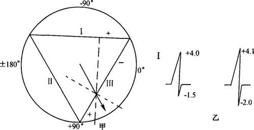 图7-3 心电图偏移的分类 (2)心电轴偏移计算法 ①目测法:根据肢体导联Ⅰ和Ⅲ的QRS方向,可以粗略估计心电轴的偏移。 a.正常心电轴:QRS波群在Ⅰ导联中的主波向上或双向,Ⅲ导联中主波向上或双向,Ⅱ导联中向上波为主。 b.心电轴偏右:QRS波群在Ⅰ导联中主波向下,Ⅲ导联中主 c.心电轴偏左:QRS波群在Ⅰ导联中主波向上,Ⅲ导联中主波向下。 d.心电轴极度偏右:QRS波群在Ⅰ、Ⅱ、Ⅲ导联中的主波均向下,呈SⅠ、SⅡ、SⅢ型。 ②三角系统法(图7-4):以Ⅰ导联的QRS波群的代数和,点于三角形的Ⅰ边上,从此点做一条垂直线。以Ⅱ导联QRS波群的代数和,点于三角形的Ⅲ边上,从此点做一垂直线。与上条垂直线的相交点,通过相交点与三角形中点的连线,即为QRS波群的平均电轴方向。