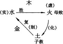 | 释义 | 正常运动—胜复制化 “胜”指偏胜,“复”指复仇,“制”为克制,“化”为生化。“胜复制化”是五行运动时,克服任何一行发生偏亢或偏衰而致乘克己所胜的另一行,或为己所不胜的另一行所乘克时,维持正常平衡的自身调节机制。中医术语“母败子救”,“子复母仇”即属此类,见图1-3。如果五行在运动过程中“水”产生实症,必然克己所胜者“火”,造成“水实火虚”的局面;或者火产生虚症,水也会加强乘克的力量,使火更虚,也会造成“水实火虚”的结果。这就是所谓“胜”。火母败伤后,子行土就会出来救母行火(母败子救),替母“复仇”,加强对己所胜的水的“克制”力量(子复母仇)。这就是所谓“复”与“制”。水受土制,不能克火,火母得救而能平复。火母平复后又能饲土子,而致生化不息,恢复了五行原来的均势。这就是所谓“化”。如果五行这种自身调节、自然平衡的机制丧失或障碍,就会出现病态的偏亢与偏衰。轻者一行自病,未传别行,重则两行兼病,或三行同病,而成五行的异常状态。