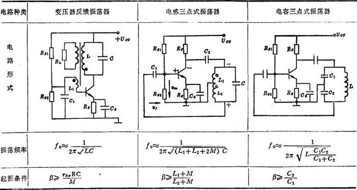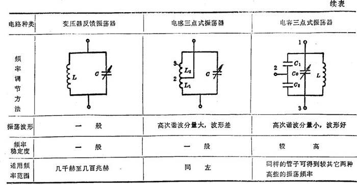 图8.3-28 正弦波振荡器原理框图 幅值条件:总幅值等于1,即 | 相位条件:总相位等于零,即 φA+φF=2πn(n是整数) 除此之外,还要求基本放大电路的放大倍数应随振荡电压的幅度变化,即当由于任何偶然因素使振幅增大时,电路总增益应小于1,使振幅自动减小:反之,当由于任何偶然因素使振幅减小时,电路总增益应大于1,使振幅自动增大。 正弦波振荡器采用的振荡电路,有LC、RC和石英晶体振荡电路等。其中.LC振荡器的种类,电路形式、振荡频率、起振条件和适用频率范围等见表8.3-21。由电感和电容组成选频网络的LC振荡电路,常用来产生高频。 表8.3-21 三种LC振荡器的比较