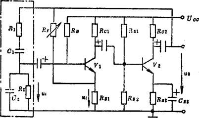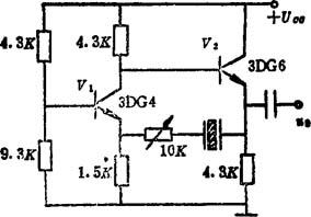 图8.3-30 采用运算放大器的RC桥式振荡电路 石英晶体振荡器的实用电路有两大类:一是石英晶体振荡器工作在靠近并联谐振频率处,称为并联晶体振荡器;另一类是石英晶体振荡器工作在靠近串联谐振频率处,称为串联晶体振荡器。图8.3-31所示是把晶体谐振器作为串联谐振回路接入电路的振荡器,该电路称为石英晶体控频振荡器。它由两级直接耦合放大电路组成,V2的发射极经过晶体谐振器和可调电阻反馈到V1的发射极,形成正反馈。由于一般放大器的输入阻抗低,输出阻抗高,故接入V2以实现阻抗匹配。调节电位器可用于改变反馈量的大小。若反馈量太小,将停振;反馈量太大,将使波形失真。几种常见的石英振荡器的主要性能见表8.3-22。