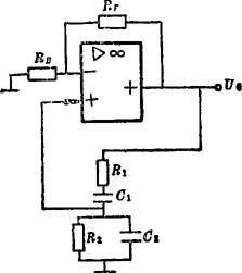 图8.3-29 RC桥式振荡电路 图8.3-30所示是采用运算放大器的桥式RC振荡电路。当R1=R2=R,C1=C2=C时,则振荡频率为 f0=1/2πRC. 电压放大倍数按同相输入端计算,即