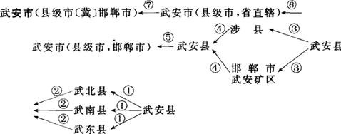 位于东经113°45′~114°22′、北纬36°28′~37°01′之间。 ①1912年称武安县;1939年10月析武安县为武北县、武南县、武东县3县。②1946年恢复武安县原建制。③1958年撤销武安县,将西部行政区并入涉县,东部建为邯郸市武安矿区。④1961年5月恢复武安县原建制。⑤1988年9月1日撤销武安县,设立武安市(县级市,由邯郸市辖)。⑥1990年武安市(县级市)改由省直辖。⑦1995年武安市(县级市)改为由省直辖,地级市代管。 1912年隶直隶省。1928年6月隶河北省。1939年10月隶晋冀鲁豫边区。1949年8月复隶河北省。 武安县(县) 见401页“武安市”、842页“磁县”。 |