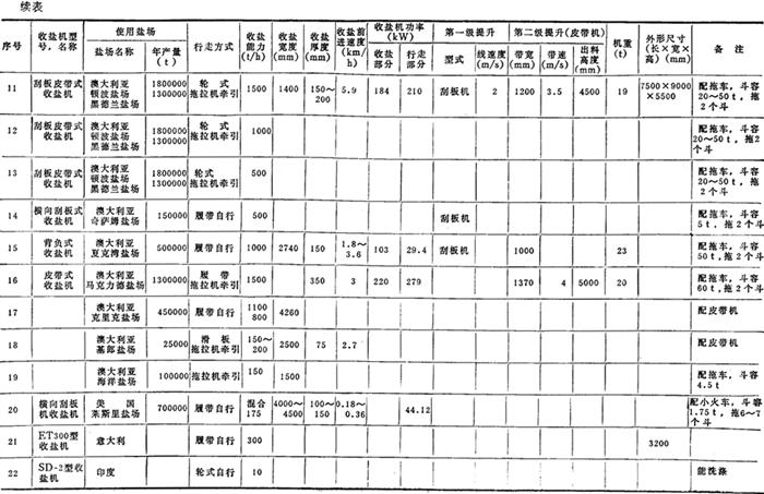 国外均为死碴盐收盐机,种类较多,主要型号及性能见表2-8-20,图2-8-28、图2-8-29分别为黑勇士盐场和意大利某盐场所使用的收盐机。