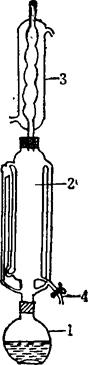 图26-3 YG-2型脂肪浸提器 1.烧瓶 2.浸提筒 3.冷凝管 4.回收嘴 2.其它试剂同油重法。 (三)测定步骤 将经脱脂定量滤纸(中速)剪成7.5×7.5cm或其它适当规格,并将滤纸折成一边不封口的纸袋。用铅笔编号,顺序排列在培养皿内(每盘不要多于20包),连脱脂线一起送入105℃烘箱中干燥2h。取出,置干燥器中冷却至室温(30min),将滤纸袋及一根脱脂线放入洁净的称量瓶中,准确称重(A)。 将同油重法一样经制备的样品(谷物1-2g,油料种子1g,不必准确称量)小心装入滤纸包中。包扎好后在105℃烘箱中干燥3h,置干燥器中冷却,准确称重(B)。则B-A为样品重。 将包有样品的滤纸包约20-30包,装入YG-2型或叶氏脂肪浸提器的浸提筒内,安装好仪器(YG-2型浸提器要在溶剂回收嘴上接一短的优质橡皮管,夹上弹簧夹),倒入无水乙醚,使之刚好超过样品包高度,浸泡一夜,将浸泡后的乙醚流入烧瓶中。然后在浸提筒中重新加入无水乙醚,使其完全浸泡滤纸包。连接好浸提器的各部分,接通冷凝水流,在75-80℃水浴中进行浸提(使由冷凝管下滴的乙醚呈连珠状)。浸提时间长短,视含油量多少而定,一般约需6-8h,如不浸泡过夜,应再延长2h。浸抽完毕,取出滤纸包,在通风处使溶剂挥发,然后将各滤纸包,按编号排列于培养皿中,放入105℃烘箱内烘干3h,置干燥器中冷却后,置原称量瓶中准确称重(C)。B-C则为被浸提出的油重。 浸提器中乙醚的回收:打开回收嘴的弹簧夹,将浸提筒内的溶剂流放入一棕色瓶中。继续加热,使烧瓶中乙醚蒸发,冷凝后滴入浸提筒内,再回收入棕色瓶,经脱水纯化后供下次测定用。 (四)结果计算