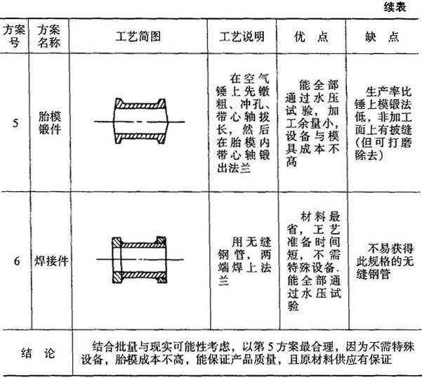 | 释义 | 毛坯生产方案优劣分析举例 图2-25为一承压油缸.该零件材料规定为45钢,工作压力为1.5MPa,要求水压试验压力为3MPa,批量200件.图纸规定内孔及两端法兰接合面要加工,不允许有任何缺陷,其余外圆部分不加工.表2-98列出该承压油缸毛坯生产方案比较.