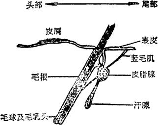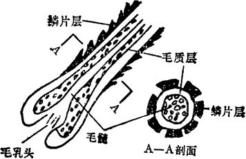 图1-14 毛在皮内生长的状况 毛有三层,即鳞片层、毛质层(皮质层)和毛髓,如图1-15。不是所有的毛都有毛髓,如绒毛便没有。