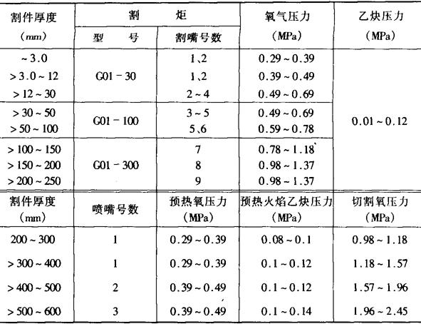 可参照表12-29选择手工气割规范和表12-30机械气割规范。一般情况下,根据切割工件的厚度来选择割炬型号和割嘴号数。