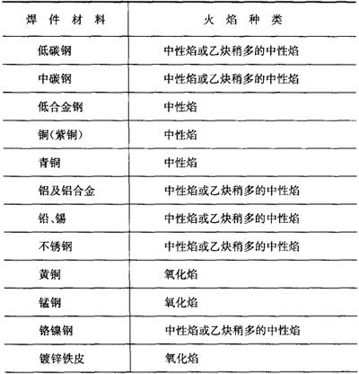 表3.7-11 各种金属材料气焊时应使用的火焰