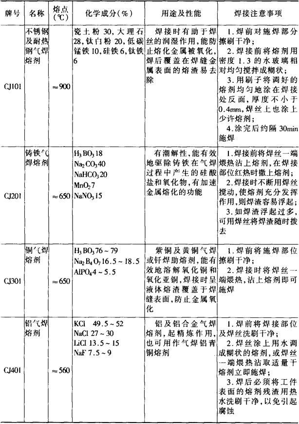 | 释义 | 气焊熔剂 气焊熔剂亦称气焊粉,它是氧-乙炔气焊时的助熔剂,其作用是除去气焊时熔池中形成的氧化物,保护熔池不受空气污染并改善金属熔池的润湿性。 低碳钢的气焊一般不需要使用熔剂,气焊熔剂主要用于合金钢、铸铁及各种有色金属的气焊。各种常用气焊熔剂牌号、化学成分和用途见表12-12。 表12-12 气焊熔剂牌号、化学成分和用途
