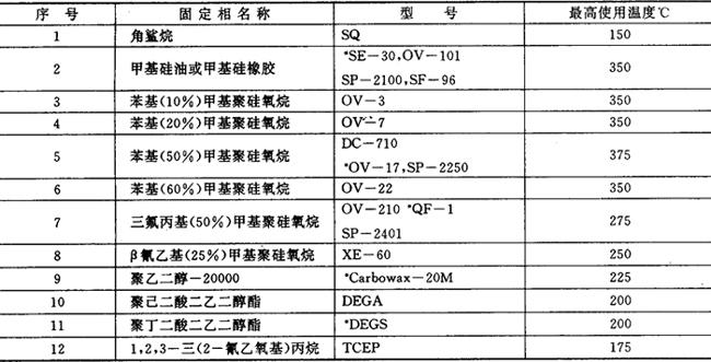 1-载气钢瓶;2-减压阀;3-净化器;4-气流调阀;5-转子流速计;6-气化室;7-色谱柱;8-检测器 图12.11-2 气相色谱过程示意图 气相色谱仪的气路系统是一个载气连续运行的密闭管路系统,由减压阀、净化器、流量调节器、流量计、压力表等构成。气相色谱常用的载气为氢气、氮气、氦气和氩气,根据所用检测器等因素进行选取。 进样系统包括进样装置和气化室,其作用是把液体或固体试样快速、定量地加到色谱柱上进行分离。 色谱柱是气相色谱仪的核心,它由柱管和填在其中的固定相组成,混合物各组分的分离就在其上完成。色谱柱材料多为玻璃和金属,柱形为U型和螺旋形,螺旋直径和柱内径之比为15∶1到25∶1。空心毛细管柱的材质多为玻璃和石英,内径为0.2~0.5mm,长度为20~300m,呈螺旋形。 色谱柱的选择性和效能,在很大程度上取决于柱内的固定相,气相色谱的固定相主要有两类,即固体固定相和液体固定相,液体固定相由固定液和载体构成。常用的固定液和固体固定相分别列于表12.11-2和12.11-3。 表12.11-2 十二种常用固定液