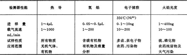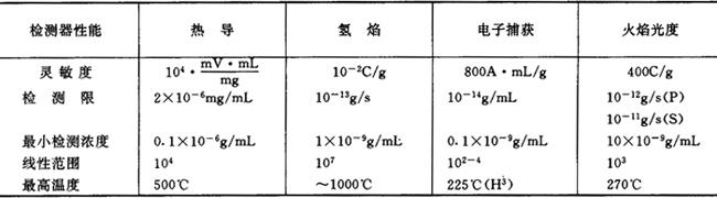 控温系统是用来设定、控制、测量柱恒温箱、气化室和检测室温度的。温度是气相色谱分析的重要操作变量之一,它直接影响色谱柱的选择性、分离效率和检测器的灵敏度及稳定性。 检测器是气相色谱仪的关键部份,它根据物质的物理或物理化学特性,辨别出各组份及其含量,实现色谱定性和定量分析的目的。色谱仪常用的检测器有热导检测器、氢火焰离子化检测器、电子捕获检测器等。常用检测器性能列于表12.11-4 表12.11-4 常用检测器性能表