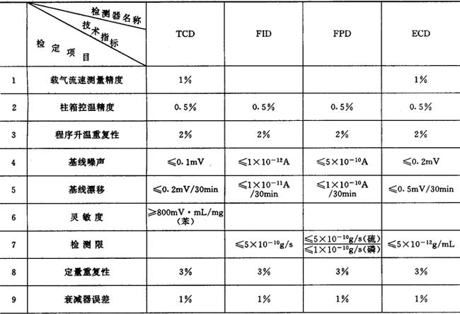 由于气相色谱法具有灵敏度高,选择性好、分析速度快等特点,已广泛地用于石油化工、食品卫生、环境监测、国内外贸易等科研生产各部门。为了保证其分析结果准确可靠,按计量法要求用于环境分析、医药临床检验、仲裁分析和贸易等方面的气相色谱仪应按规定进行计量检定。检定的依据是JJG700-90气相色谱仪检定规程,检定的主要技术指标列于表12.11-5,检定条件和方法参看气相色谱仪检定规程有关部份。 表12.11-5 气相色谱仪的主要技术指标