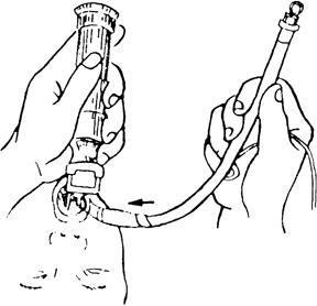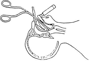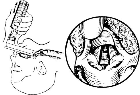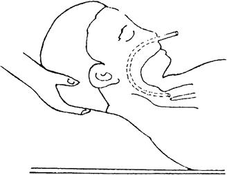 图2-34 气管插管时持管与插入方法 (6)于气管导管旁塞一牙垫,然后退出喉镜。操作者将耳凑近导管外端,感觉有无气体进出。若患者呼吸已停止,可用嘴对着导管吹入空气或用呼吸囊挤压,观察胸部有无起伏运动,并用听诊器听两肺呼吸音,注意是否对称。如呼吸音两侧不对称,可能为导管插入过深,进入一侧支气管所致,此时可将导管稍稍后退,直至两侧呼吸音对称。 (7)证实导管已准确插入气管后,用长胶布妥善固定导管和牙垫。 (8)用注射器向气管导管前端的套囊注入适量空气(一般注5ml左右),以不漏气为准。用血管钳或夹子夹闭气囊管。套囊充气可使导管与气管壁间密闭,以免机械呼吸器在向肺内送气时漏气,也可防止呕吐物、分泌物等倒流至气管内。 (9)用吸痰器向气管导管内试吸分泌物,了解呼吸道通畅情况。 (二)经鼻明视插管术 当启口困难(如颞颌关节强直)或口腔内插管妨碍手术进行时,采用此法。 (1)术前仔细检查患者鼻腔有无鼻中隔弯曲、息肉、纤维瘤等异常现象。选择好合适的鼻孔,必要时滴入少量呋麻液。 (2)挑选好合适的导管(不带套囊),头端涂抹凡士林油,也可向插管侧鼻孔滴入少量石蜡油。 (3)患者体位同经口明视插管术。将导管与面部呈垂直方向插入鼻孔,沿下鼻道经鼻底部出鼻后孔至咽喉腔。插入导管深度相当于鼻翼至耳垂长度时,使用咽喉镜暴露声门,右手继续将导管深入,使其进入声门。如有困难,可用插管钳夹持导管前端并挑起,然后由助手将导管送入声门(图2-35)。其他步骤基本同经口插管。