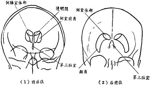 图136 气脑造影头位 2.密切观察病人意识状态、呼吸、脉搏、血压以及瞳孔的变化。 3.将双耳轮拉向前方,用胶布粘好,以免影响第四脑室的显影。 4.注气法:可注入滤过空气或氧气(氧气刺激反应较小,但吸收较快,显影差),先放出脑脊液5毫升,而后再注入气体5毫升,如此等量、缓慢气液交换。注入15毫升时,拍头颅侧位片1张,观察气体是否已进入脑室,如脑室未见充气,应调整头位或检查器械是否漏气,注入气体量,根据病情与显影程度,一般在40~60毫升,脑萎缩病变时,可注入70~100毫升。 5.如需颅底、脑池、大脑表面显影时,可将患者头后仰15度,注气15~20毫升拍片;若使小脑背部充气时,宜将头前倾25度,注气15毫升。 6.充气完毕拔针,移患者至摄片台上(应固定病人头部,以免气体外逸),拍头颅前后位、后前位、左、右侧位片(拍摄另一侧脑室片时,应将病人头部轻轻摇动,以利气体通过侧室孔,进入另一侧脑室)。 (二)高压定向小剂量气脑造影: 1.适应症:颅内占位性病变、颅内压增高,以及脑室造影、脑血管造影显影不良,诊断困难者。 2.术前准备与用药:颅内压增加者,术前静脉注射50%葡萄糖40毫升,或静脉点滴20%甘露醇200~250毫升。 3.注气法:体位同普通气脑造影,穿刺后勿放脑脊液,注气约8毫升时,拍摄包括第二颈椎在内的头侧位片,以观察第四脑室、导水管、第三脑室的显影情况,以及有无小脑扁桃体疝(如有小脑扁桃体疝,应终止造影,改行脑室造影)。 4.当脑室已显影充气,可继续以5∶3的比例进行气液交换,缓缓注气约20毫升,如疑似后颅窝病变时,可拍摄15~30度的后前位片,以便观察第四脑室、导水管、第三脑室及部分侧脑室有无移位。若需显示桥池、脚间池、交叉池、第三脑室前部,当充气25毫升时,改头后仰15~20°,再注气5~10毫升,拍摄侧位片。 注气总量不宜过多,一般注气30毫升左右,坐位摄片结束后,即可拔针,改取卧位,根据病情需要拍摄前后位,后前位,左、右侧位,以及其他所需之位置颅片(图137、138、139)。