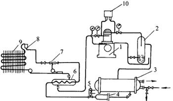 图4-13-1 单级压缩氟利昂制冷系统 1-压缩机 2-油分离器 3-水冷式冷凝器 4-干燥过滤 5-电磁阀 6-气液热交换器 7-热力膨胀阀 8-分液头 9-蒸发器 10-高低压继电器 |