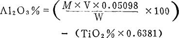 (二)试剂配制 1.2%二甲酚橙指示剂 称2g二甲酚橙溶于100ml蒸馏水中。 2.pH6醋酸—醋酸铵缓冲溶液将60g醋酸铵与2ml冰醋酸溶于水后,定容到1L。必要时可用稀醋酸和稀氢氧化铵调节pH(可用酸度计调测)。 3.0.015mol醋酸锌标准溶液 称取3.3g醋酸锌〔Zn(CH3COO)2·2H2O〕加冰醋酸1-2滴,定容到1L(必要时过滤),用下述方法进行标定。 (1)取0.0150molEDTA标准溶液10ml,加1滴二甲酚橙指示剂,用1∶1氢氧化铵调到紫色,再用2%盐酸调到黄色,加pH6缓冲溶液5ml,用待标定的醋酸锌溶液滴定到微紫色,计算其浓度。 (2)取含0.005g三氧化二铝标准溶液,用与待测液的同样测定步骤进行标定,计算出每毫升醋酸锌相当于三氧化二铝克数(即表示滴定度)。 4.三氧化二铝标准溶液 准确称取经700℃灼烧过的三氧化二铝0.2500g,放入加有3g无水碳酸钠的铂坩埚中,搅拌均匀,在高温电炉中经1000℃熔融1h,取出稍冷,小心捏动坩埚四壁,使熔块与坩埚分离。然后将熔块移入烧杯中,并加少量水,再加30ml浓盐酸溶解熔块,待溶液清亮后移入250ml容量瓶中定容,摇匀,该溶液即为每毫升中含三氧化二铝1mg。 5.0.0150MEDTA标准溶液 称取分析纯EDTA二钠盐5.580g,用无二氧化碳蒸馏水溶解,定容到1L。此液若精确称取可不必标定。如欲标定可用标准钙或镁盐标定。 6.0.1%对硝基酚指示剂 0.1g对硝基酚溶于100ml水中。 (三)测定步骤 吸取上述脱硅后的(系统分析用)待测液(见第三节)20ml,移入250ml三角瓶中,煮沸1-2min,以破坏动物胶。然后加0.0150mol EDTA标准溶液25ml,加水70ml,加热80-90℃,再加0.1%对硝基酚指示剂3滴,用1∶1氢氧化铵调至黄色,然后再用1N盐酸调到无色,加pH6缓冲溶液12ml,放沸水浴中煮10min,冷却,再加二甲酚橙指示剂6滴,用醋酸锌标准溶液滴定到刚变红紫色(此次滴定不必记用量)。加20%氟化钾溶液10ml,摇匀,再在沸水浴上加热煮5min,冷却至室温,补加二甲酚橙指示剂6滴,再用醋酸锌标准溶液滴定至刚变红紫色,记下醋酸锌溶液用量。 (四)结果计算