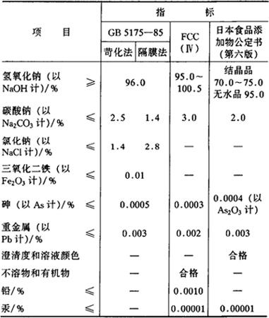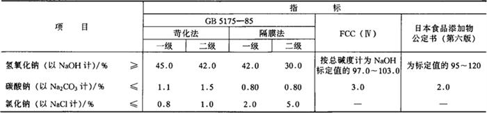 | 释义 | 氢氧化钠 别名 苛性钠、烧碱、火碱 编码 GB 01.201;INS 524 化学结构 NaOH 相对分子质量 40.00 性状 有结晶及无水物两种。白色或近乎白色,或微带颜色。为有光泽的丸、片、棒、块或其他形状。纯品是无色透明晶体,相对密度2.130,熔点318.4℃,沸点1390℃。暴露于空气中易吸湿,且最后完全溶解成液体。易溶于水并强烈放热,水溶液呈强碱性,有强腐蚀性。4%水溶液的pH为14。也可溶于甲醇、乙醇、甘油等,不溶于乙醚、丙酮。易从空气中吸收二氧化碳而逐渐变成碳酸钠。此外,也有液体氢氧化钠产品。 制法 (1)由隔膜法电解食盐制得。 (2)将碳酸钠与石灰乳作用,除去碳酸钙后浓缩制得。 质量标准 1.固体氢氧化钠