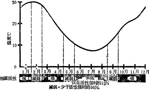 图17.9 在新南威尔士州内陆15厘米的非耕地中接近于月平均的土温和有关的细菌活性 每公顷施用60公斤氮素的氨,施肥间距为75厘米,在土壤温度为20-25℃和适宜的水分条件下,大部分铵于两个星期内被硝化。而在15℃时,就要近4个星期,如在10℃,可能要8星期,要是10℃以下,在温暖环境恢复之前只能产生少量的NO3-。 土层浅,土温波动范围大。而在环境还处于比较冷的地方,土层较深,土温变化就小。 波动的温度有利于细菌的活动。秋天和春天比起其它时期,硝化作用更快,特别是在10厘米的土壤表层。 (2)水分 正常有机质分解和硝化作用要在田间持水量和凋萎点之间的土壤含水量下进行。在此含水量以外,硝化作用大大地受到抑制。 如同温度的情况一样,当土壤水分含量不稳,但只在适宜的水分范围内波动,这样的环境对于硝化作用最为有利。这正是适于耕种的土壤条件。 秋雨季节,土壤温度一般比较理想,有机物质的腐烂和硝化作用也加剧。 (3)氨的浓度 铵的浓度大约在1500ppm以上,就可以抑制硝化细菌。有关土壤吸持铵的数量和高浓度铵态氮的变化,可参见图17.7。在某些土壤中,1500ppmNH4-N的点应接近于pH8.5的那条线(见图17.7)。