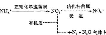 图17.15 反硝化作用 由生活在没有空气的湿土中的微生物所引起,它们靠硝酸根(NO3-)获得所需要的氧。 有利环境:温暖与具有大量植物残体的潮湿土壤(腐烂残体的土壤微生物迅速地利用所供给的游离氧,于是反硝化微生物就成倍地繁殖)。 液氨的反硝化损失不比其它任何来源的氮素大,甚至更少。这是因为在施肥带氨浓度高,硝化作用比较慢之故。 但是在嫌气环境下,通过反硝化微生物的作用,大量的氮素会遭到很快的损失。排水差和淹水的粘性土壤(一般在灌区零星分布),为反硝化作用提供了理想的环境。大雨或灌溉时积水洼地几小时内可将原来施用的氮素全部损失。 在进行硝化作用时,如果土壤积累了大量的亚硝酸盐,有机质会导致亚硝酸根(NO2-)的不稳定而形成气态氮。