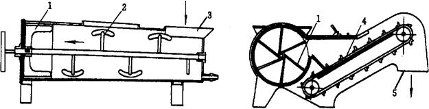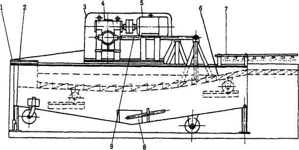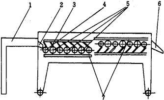 图1-12-22 振动筛式洗鱼机 1-箱体 2-清水管 3-减速箱 4-蜗轮减速器 5-电动机 6-振动筛 7-喷水管 8-排污门 9-偏心连杆 该机工作原理:电动机5通过传动机构,采用蜗轮减速器4,经偏心轮、偏心连杆9和振动筛6相连,从而带动振动筛作往复运动。鱼从进料口落到振动筛内,该筛约2/3浸在盛水箱体1内,当振动筛往复运动时,鱼体被冲洗并向前输送;振动筛的另外1/3露出水面,当鱼被送到此处时,由喷水管7对鱼体喷淋、冲洗。洗净的鱼经出料口由输送带送到下一道工序。箱体两端装有清水管2,用于冲洗残留在斜坡上的污渣,污水从底部排污门8排出箱体。 3.1.2筒式洗鱼机(图1-12-23) 筒式洗鱼机洗鱼筒卧放为圆锥形,稍有倾斜。圆筒的两端装有供水管,上部开有进料口3,尾端内装有拨鱼器,并联在与圆筒成90°的输送带机械上,输送带侧边装有齿轮变速箱和传动装置。