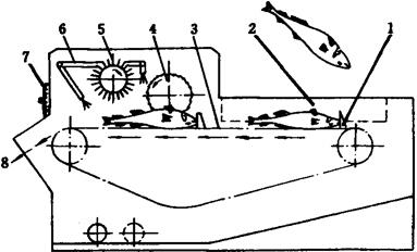 图1-12-25 双刀去鱼头机 1-切刀电机 2-刀具 3-夹紧装置 4-输送带 两把切刀分别由2台电动机1控制。切刀呈V形排列,并可根据鱼体大小进行调节。输送带上设有盛鱼槽,呈12°倾斜,盛鱼槽前部均有一副鱼头夹紧装置3,可避免切头时鱼体产生外移。工作时,将鱼置于盛鱼槽内,利用鱼体的自重使鱼头向下倾斜,鱼腹向上,同时鱼头被夹紧装置夹住。然后,输送带向前输送,当通过V形的切刀时,鱼头被切除。 3.5 剖腹、去内脏机 剖腹、去内脏机分为无头鱼剖腹、去内脏机和带头鱼剖腹、去内脏机。 3.5.1 无头鱼剖腹、去内脏机(图1-12-26) 无头鱼剖腹、去内脏机主要由夹鱼输送带、导向器、剖腹刀、去内脏轮及传动系统组成。