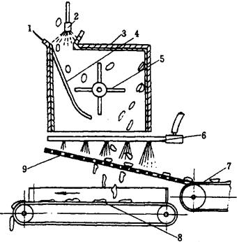 图1-12-30 转轮冲击式脱肉机 1-入料口 2-喷水嘴 3-脱壳箱 4-导板 5-叶片 6-高压喷水管 7-贝壳输送带 8-贝肉输送带 9-网状斜面 |