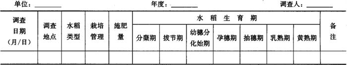 2.2 水稻生育期调查 在水稻幼穗分化初期,选择当地主栽品种稻田若干块,每块田随机拔取主蘖苗10株,逐一查幼穗,记载幼穗分化时期,确定破口期。结果记入表4-18。 表4-18 水稻发育进度调查表