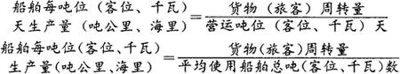 上述指标受着货流、货种、水位、管理技术等各种因素的影响,水运企业要提高船舶运载能力,还需积极组织货源,进行合理的组织调配,提高配载人员的业务水平等。 (4)船舶生产效率指标,是反映船舶在营运时期内生产、工作效率的指标。主要有:船舶每吨位(客位、千瓦)天生产量、船舶每吨位(客位、千瓦)生产量等。其计算公式如下: