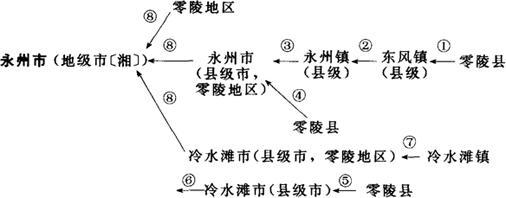 ①1912年称零陵县;1979年4月析零陵县东风镇、七里店乡、朝阳乡成立县级东风镇。②1980~1981年改为永州镇(县级)。③1982年1月23日,经国务院批准,以永州镇和零陵县部分行政区域设立永州市(县级市),隶零陵地区。④1984年7月,撤销零陵县,将原零陵县的40个乡划入永州市。⑤1960年6月,经国务院批准,析零陵县城设冷水滩市(县级市)。⑥1962年12月撤市复镇。⑦1984年6月恢复冷水滩市(县级市),隶零陵地区。⑧1995年11月21日,经国务院批准,撤销零陵地区、永州市(县级市)和冷水滩市(县级市),设立地级永州市。