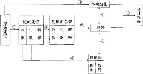 | 释义 | 汇总记帐凭证核算形式 由于记帐凭证存在着登帐工作量大的缺点,所以在记帐凭证核算形式的基础上发展产生了汇总记帐凭证核算形式。汇总记帐凭证核算形式,是根据记帐凭证编制汇总记帐凭证,再根据汇总记帐凭证登记总帐的一种核算形式。 采用汇总记帐凭证核算形式时,设置的帐簿主要有:现金日记帐、银行存款日记款、总帐及各明细帐。 汇总记帐凭证核算形式的基本特点是设置汇总记帐凭证,定期地对记帐凭证记录的经济业务按帐户对应关系加以整理归类,月末根据按帐户对应关系累计汇总的数额一次过入总帐。其过程如下: (1)根据原始凭证或原始凭证汇总表编制收款凭证、付款凭证、转帐凭证。 (2)根据收款凭证、付款凭证逐笔登记现金日记帐、银行存款日记帐。 (3)根据原始凭证、原始凭证汇总表或记帐凭证逐笔登记各种明细帐。 (4)根据收款凭证、付款凭证、转帐凭证分别定期编制汇总收款凭证、汇总付款凭证、汇总转帐凭证。 (5)根据汇总收款凭证、汇总付款凭证、汇总转帐凭证逐笔登记总帐。 (6)月终,现金日记帐、银行存款日记帐的余额以及各种明细帐的余额合计数,应分别与总帐中有关帐户的余额核对相符。 (7)月终,根据总帐和各明细帐的记录,编制会计报表。 其步骤如图表1-5-2。 图表1-5-2 汇总记帐凭证核算形式流程图
